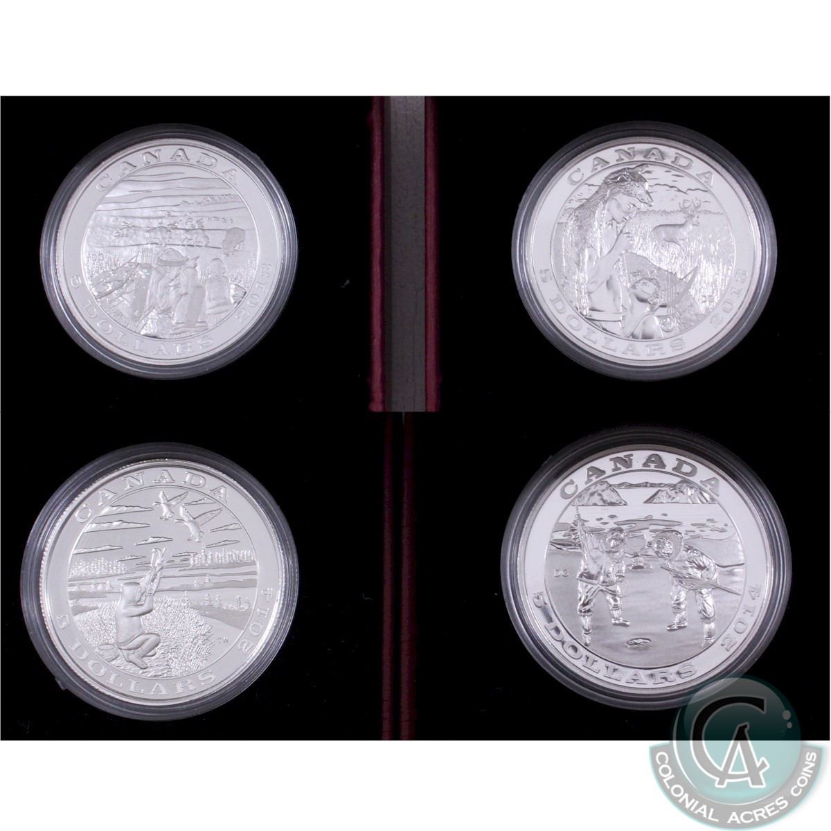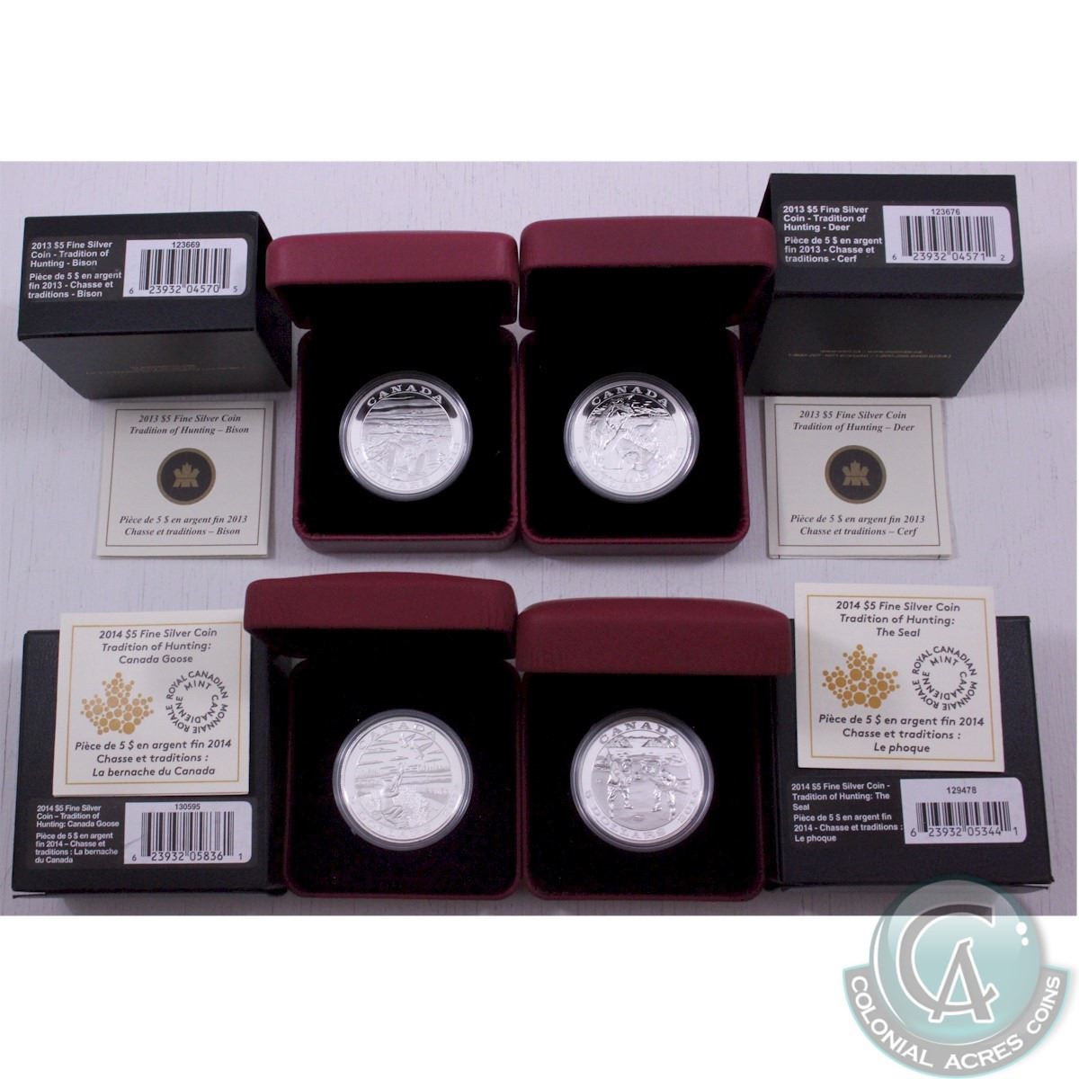 RCM Lot: 2014 $5 Fine Silver Tradition of Hunting Series Fine Silver Coins. You will receive the 2013 Tradition of Hunting Bison, 2013 Tradition of Hunting Deer, 2014 Tradition on Hunting Goose , and the 2014 Tradition of Hunting Seal (TAX Exempt). Each Coin comes in all the original Mint packaging.