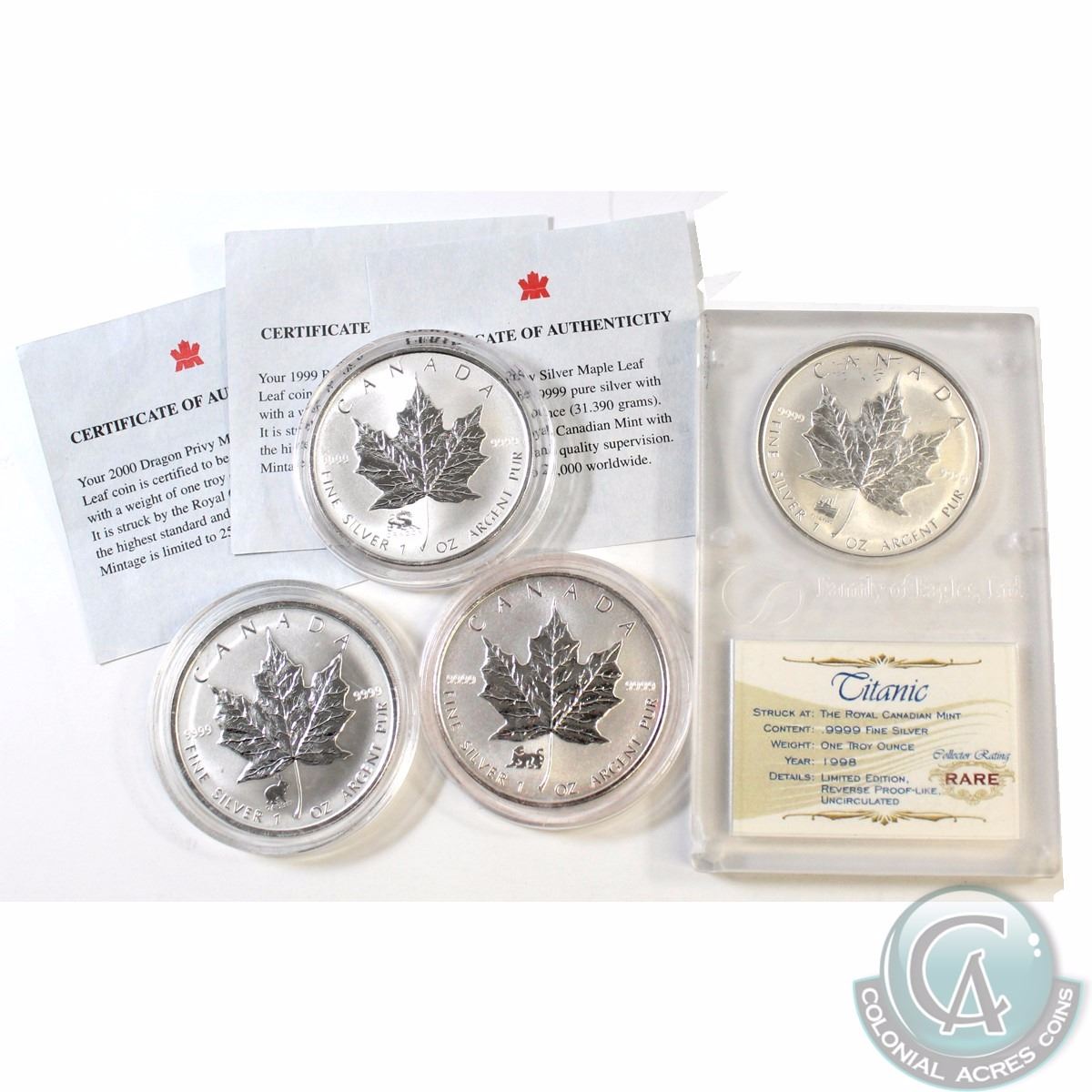 RCM Lot: 4x Canada $5 Fine Silver Proof Privy Maple Leafs in Capsules. You will receive 1998 Titanic in hard plastic holder, 1998 Tiger, 1999 Rabbit (light toning spot) & 2000 Dragon (scratch on obverse). All come with COAs except the Titanic privy (Capsules are scratched). 4pcs (Tax Exempt)