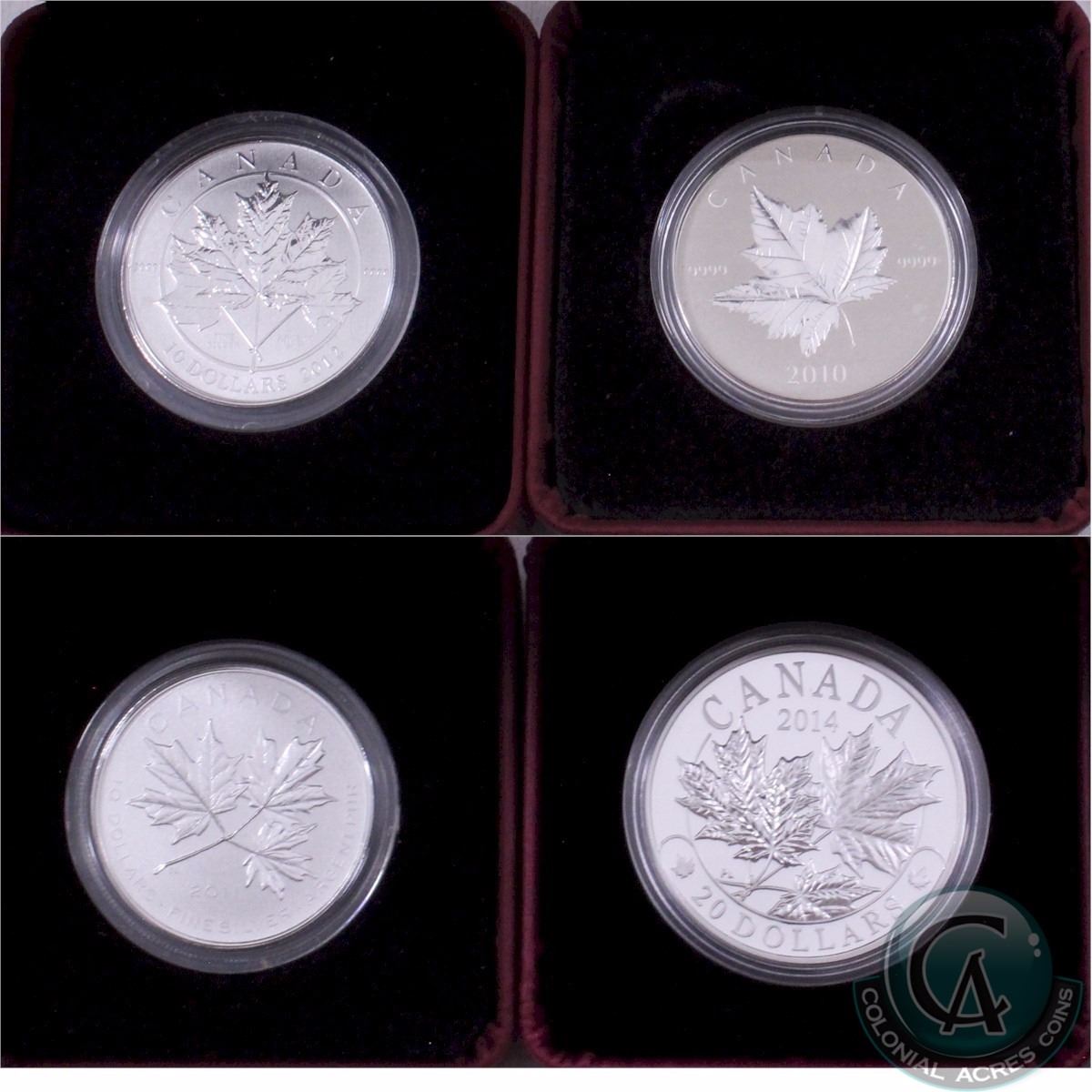 RCM Lot: 4x Canada Commemorative Silver Maple Leaf Fine Silver Coins. This lot includes the 2011 $10 Maple Leaf Forever, 2012 $10 Maple Leaf Forever, 2010 Piedfort Silver Maple and the 2014 $ Fine Silver Majestic Maple Leaves. Each Coin comes encapsulated with display box and Certificate (2012 Maple Leaf Forever is missing its Certificate and the 2010 Piedfort's COA is discoloured). TAX Exempt (4pcs)