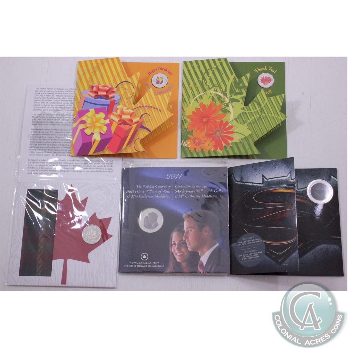 RCM Lot: 5x 2010-2016 Canada Commemorative coins. This lot includes the 2010 Happy Birthday 25-cent, 2010 Thank You 25-cent, 2011 Royal Wedding 25-cent, 2013 The Maple Leaf Tartan 50-cent, and the 2016 Batman Vs Superman Lenticular 25-cent (5pcs)