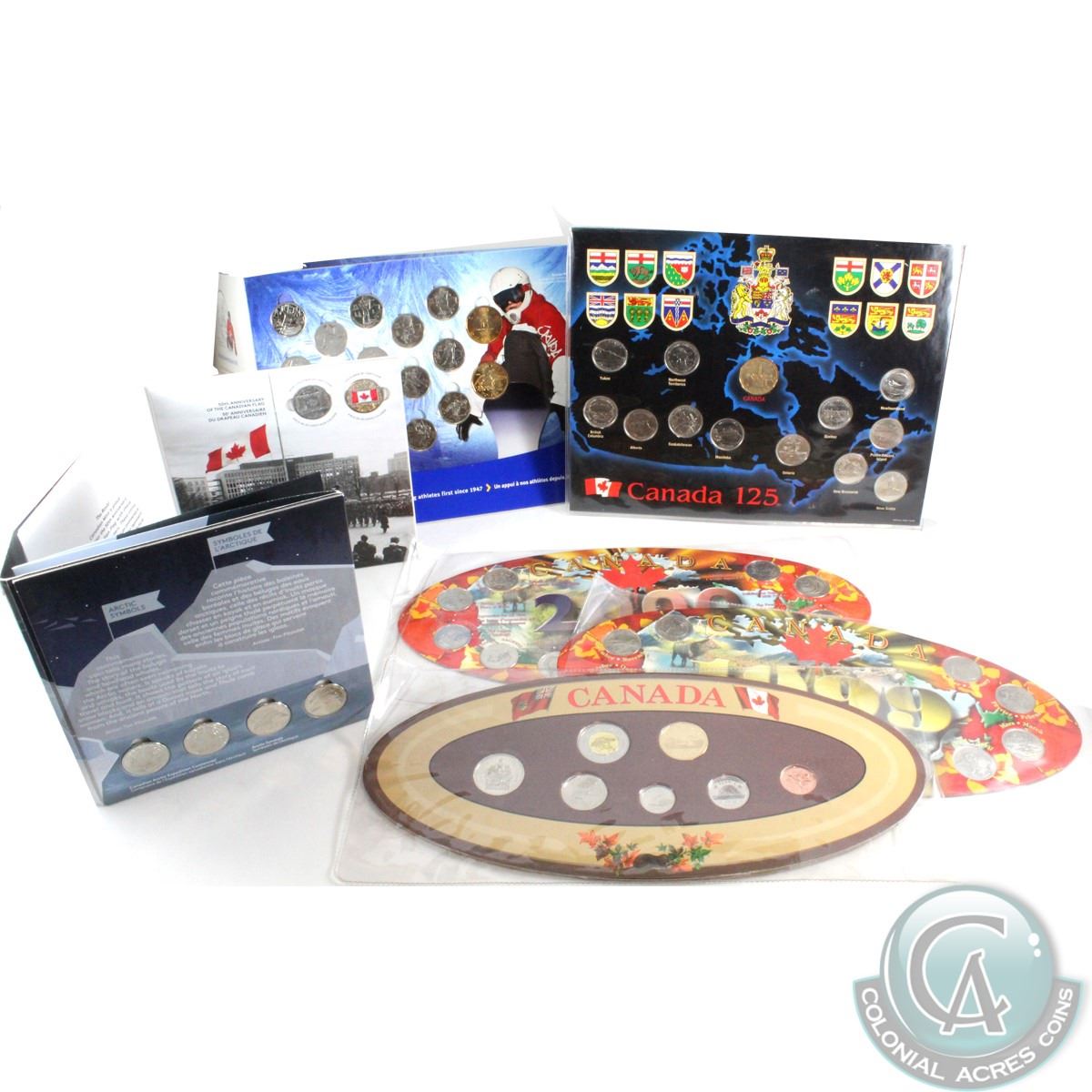 RCM Lot: 7x Canada Commemorative Coin Sets with Colourful Display Holders. This lot includes the 1992 13-coin set, 1999 Millennium 13-coin set, 2000 Millennium 13-coin set, 2000 7-coin set with one of each coin issued for 2000, 2010 Vancouver Olympics 17-coin set, 2013 Heart of the Arctic 4-coin set, and the 2015 Flags of Canada 1-coin set. (7 sets)