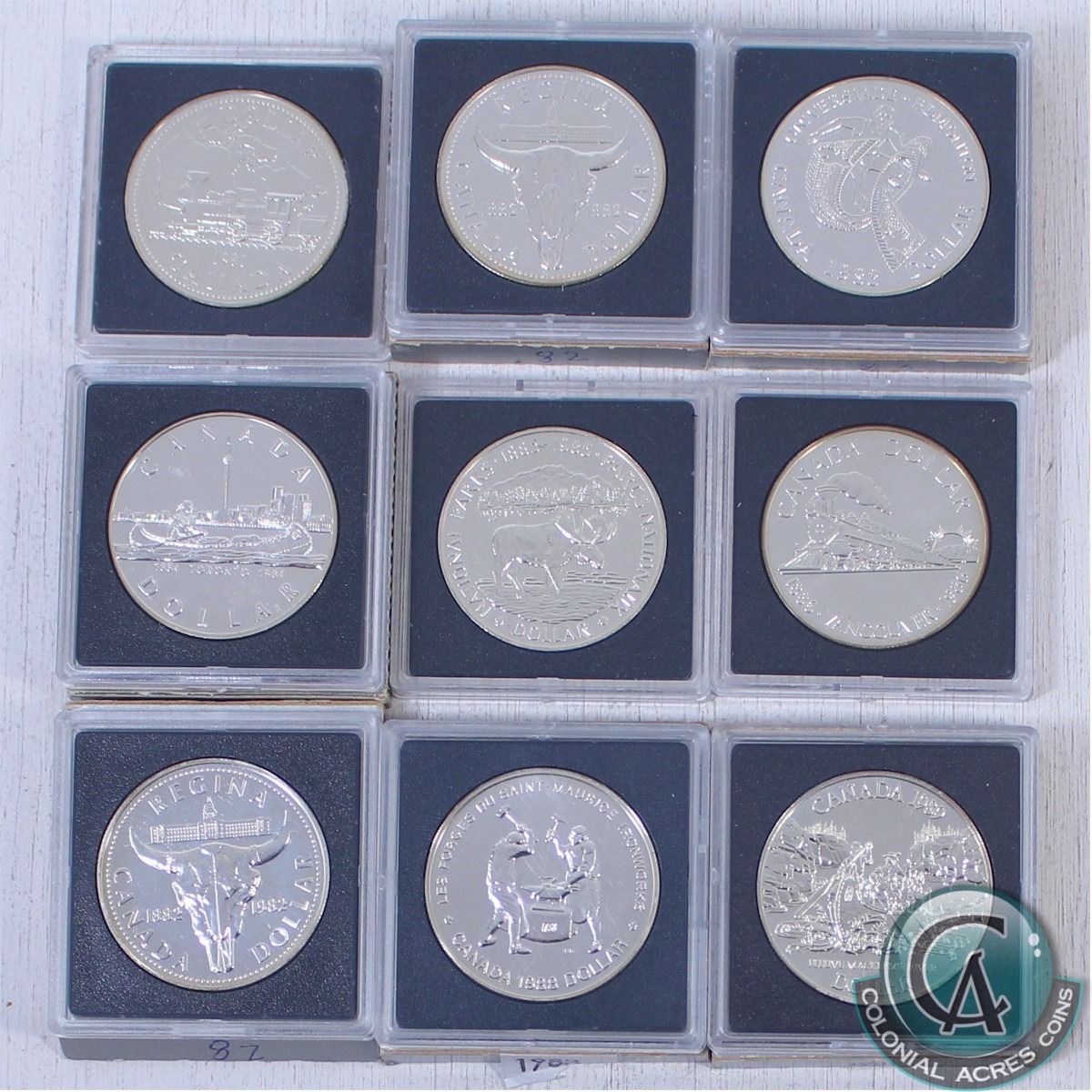 RCM Lot: 9x Canada Brilliant Uncirculated Silver Dollars. You will receive dates ranging from 1981-1989. Comes in Original Mint Packaging (1988 is missing the outer cardboard sleeve) 9pcs