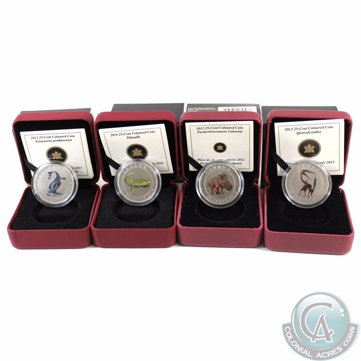 RCM Lot: Canada 4x 2012-2014 25-cent Glow in the Dark Dinosaur Series. You will receive the following Coins: 2012 Pachyrhinosaurus Lakustai, 2013 Quetzalcoatlus Dinosaur, 2013 Tylosaurus Pembinensis, and the 2014 Tiktaalik Coin. 4pcs.
