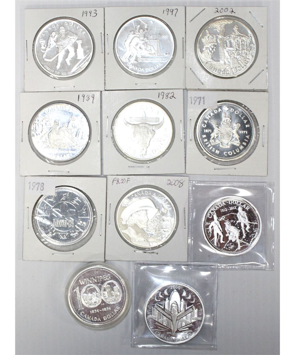 RCM Lot; Comemmorative Silver Proof Dollars in Cardboard or Plastic Holders. Years Included: 1971, 74, 78, 82, 89, 93, 97, 00, 02, 08, 12. Lot of 11 coins. No returns, sold as is