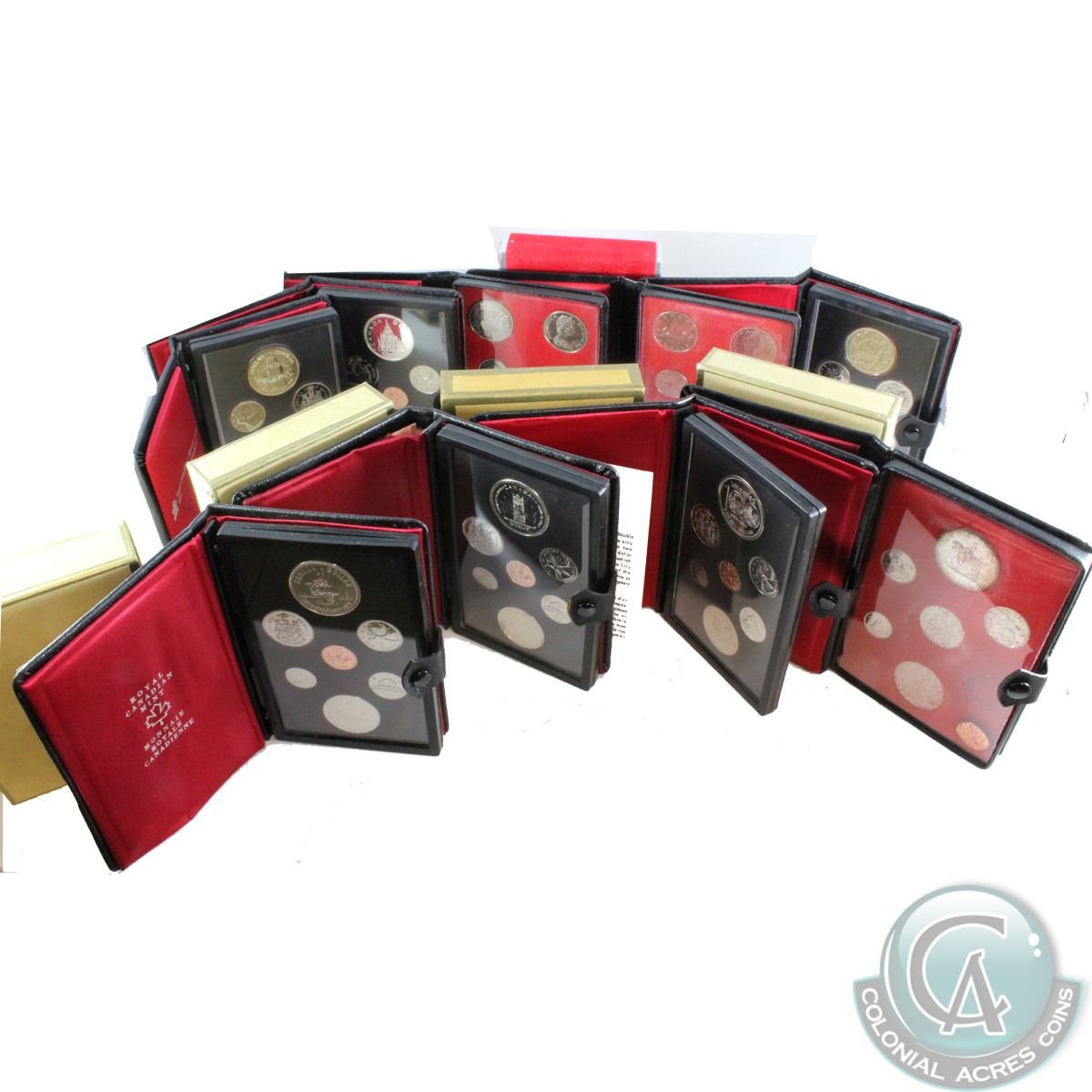 RCM Lot: Complete set of 1971-1979 Canada Proof Double Dollar Sets. These sets comes in their original mint folders (some coins in these sets contain some natural toning and some of the inner felt is disturbed). 9 sets