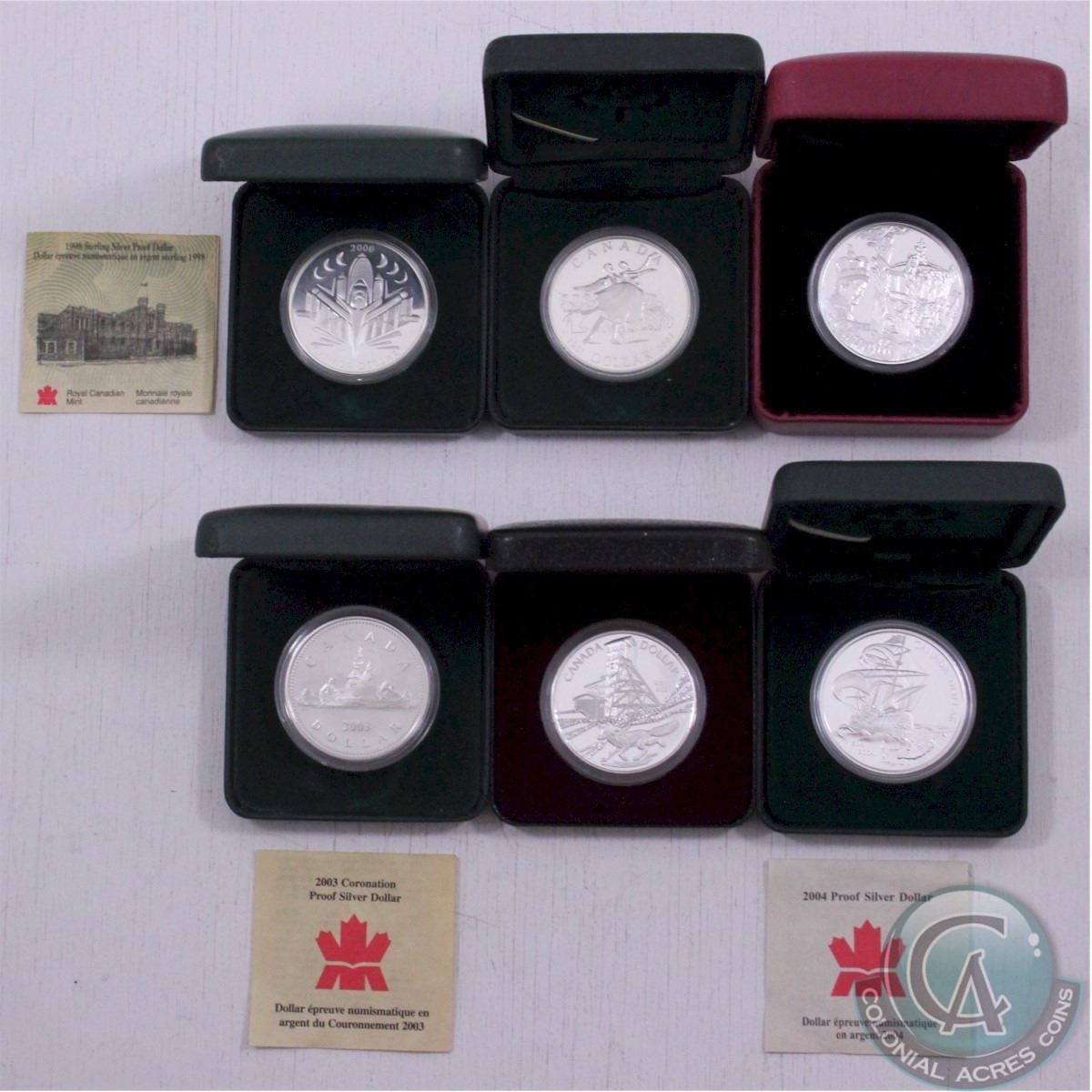 RCM Lot: Complete set of 2000-2004 Canada Proof Commemorative Silver Dollars. This lot includes the 2001, 2002, 2003, 2003 Coronation, and 2004 Proof Commemorative Silver Dollar (some coins in this lot are naturally toned). Each coins comes encapsulated with display box. (6 pcs)