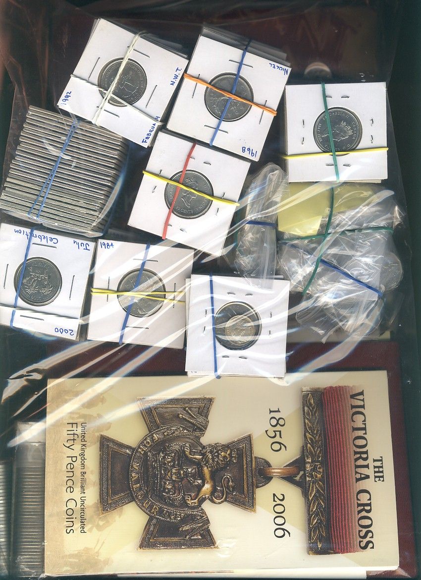 RCM Lot. Includes Annual reports 2003, 2004, 2005 & 2006, 2006 Proof Set, 2005 Official first day cover with 5¢,1856-2006 Britain Victoria Cross Fifty Pence coins along with Circ coinage 1992, 1999, 2000 25¢ set complete, various nickel 25¢ dates ($14,25).