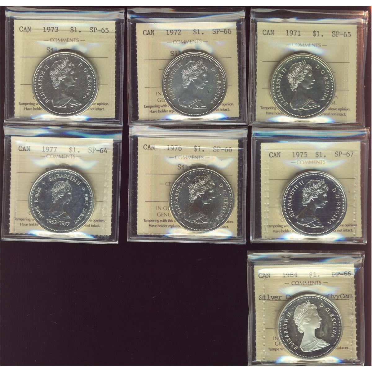 RCM Lot; includes 1971 Silv $1, 1972, 1973, 1975, 1976, 1977 all SP64 to SP67 & 1984 $1 PF66UHC. Lot of 7 coins all ICCS graded.