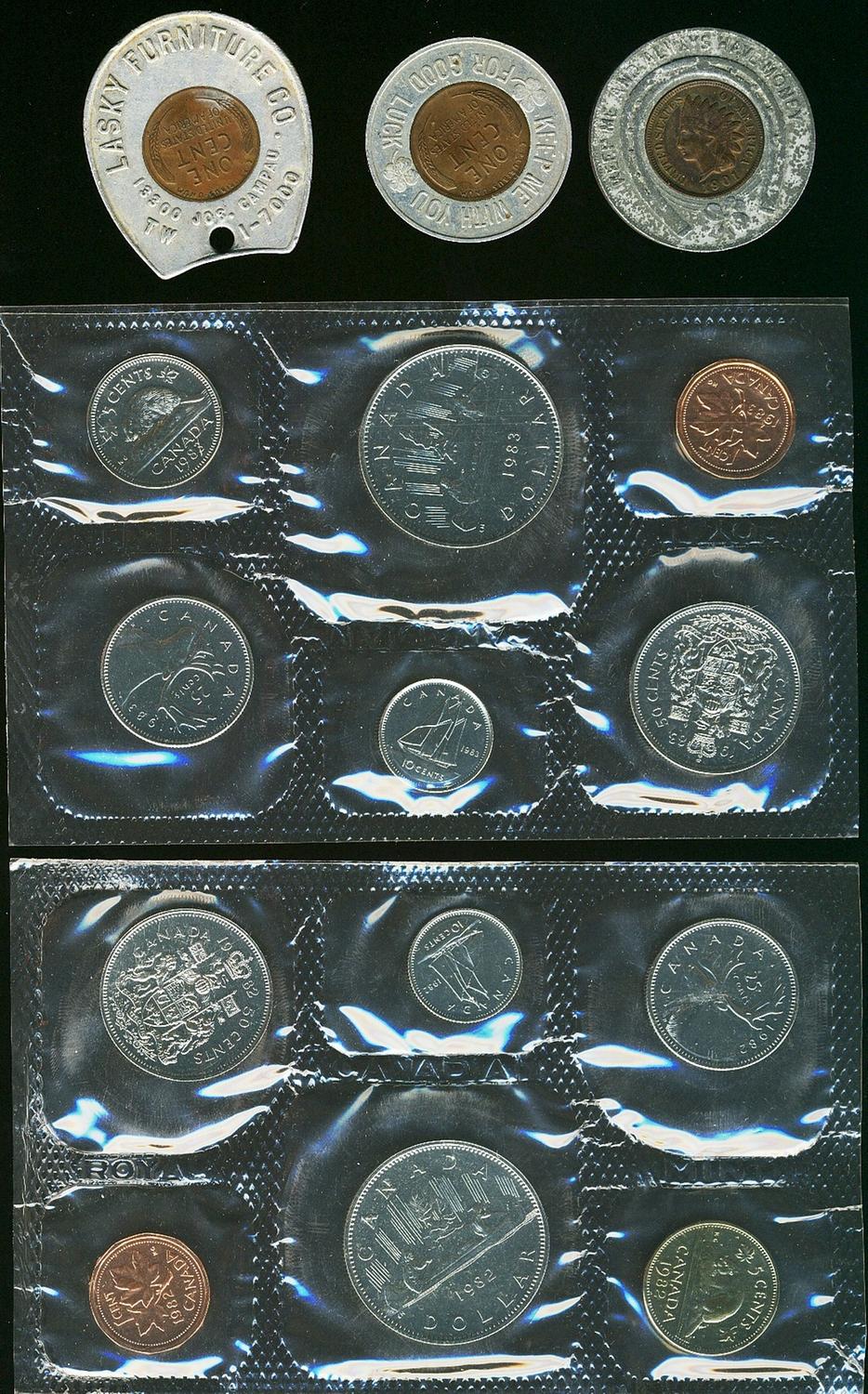 RCM Lot includes 1982 & 1983 Proof Like sets. Also includes 3 US cents 1901, 1947 & 1948 in Good Luck aluminum rims.