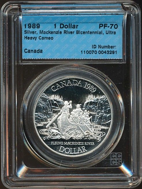 RCM Lot; includes 1989 $1 Silver CCCS PF70 Ultra Heavy Cameo. Commemorates MacKenzie River Bicentennial. Perfect example.