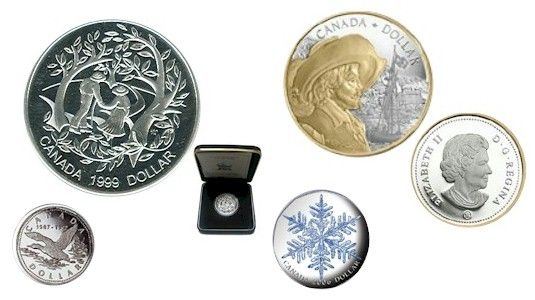 RCM Lot; includes 1997 $1 Silver Proof Loon, 1999 Proof Year of the Older People, 2008 Proof $1 Gold Plated J. Cartier & 2006 $1 Blue Snowflake. Lot of 4 pcs all without case.