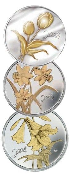 RCM Lot; includes 2002 Golden Tulip, 2003 Golden Daffodil & 2004 Easter Lilly. Lot of 3 coins all in original green leather case but no sleeves.
