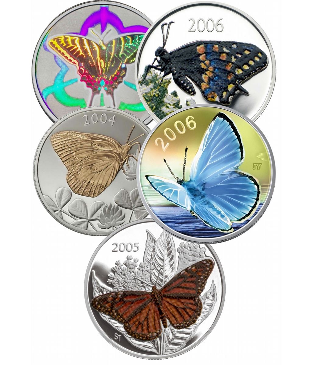 RCM Lot; includes 2004, 2005 & 2006 50¢ Butterfly Collection: 2004 Tiger Swallowtail , Clouded Sulfur, 2005 Monarch, 2006 Short-Tailed Swallowtail and Silvery Blue. Lot of 5 coins. Comes in original packaging.