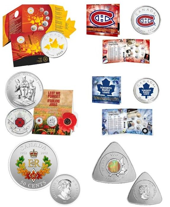 RCM Lot; includes 2005/2006 Montreal Canadiens, Toronto Mapleleafs(2) Gift Sets, 2009 Oh! Canada, 2009 Six Nations Set, 2012 The Queen's Diamond Jubilee Coloured 50¢ & 2008 Lest We Forget 2 coin Set.