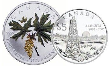 RCM Lot; includes 2005 $5 Proof Coloured Maple Leaf & Alberta's Centennial issue. Tax Exempt