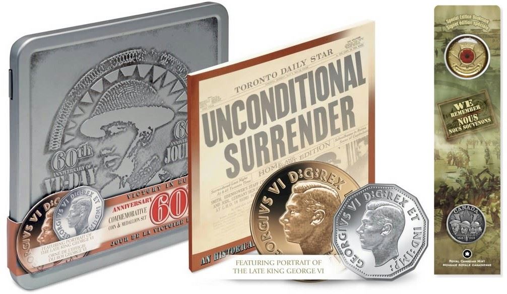 RCM Lot; includes 2005 5¢ Silver 'Victory In Europe' Coin & Medallion set(4) & 25c 2005 We Remember Poppy Bookmark and Lapel Pin (8). Lot of 11 pcs all in original holders.