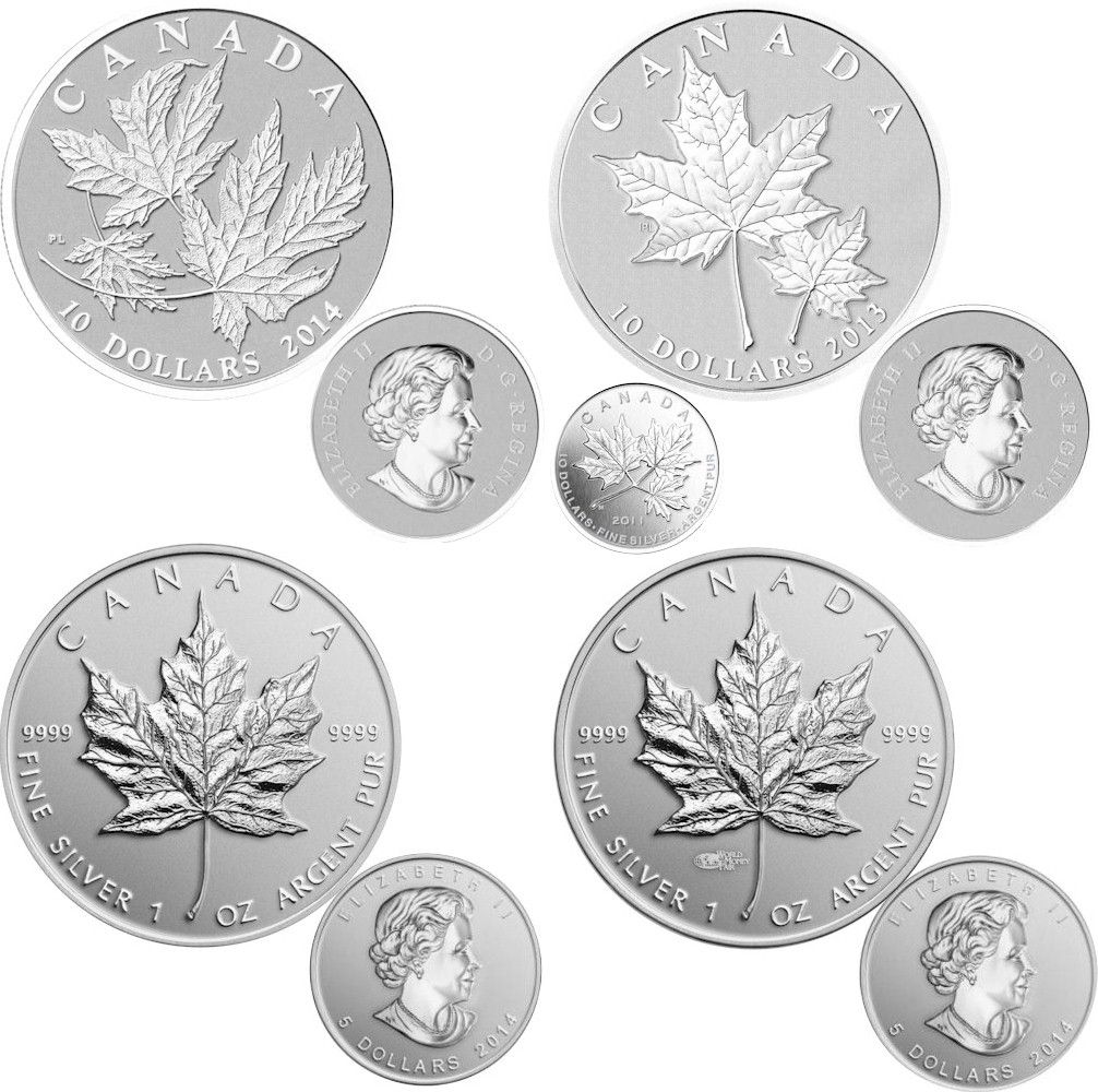 RCM Lot; includes 2011 $10 1/2oz Maple Leaf Forever, 2013 $10 Fine Silver Coin - Maple Leaf, 2014 $10 Fine Silver Coin - Silver Maple Leaf, $10 Fine Silver Coin - Bullion Replica & $5 Fine Silver Coin - Bullion Replica with World Money Fair Privy Mark. TAX Exempt. Lot of 5 coins all in original holders.