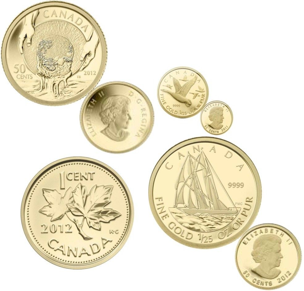 RCM Lot; includes 2011 50¢ Gold Goose, 2012 Bluenose, Caribou & 1¢ issue. Lot of 4 pcs. Tax Exempt