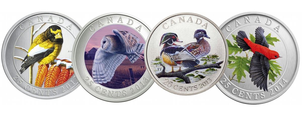 RCM Lot; includes 2012, 2013 & 21014 25¢ Coloured Coin Evening Grosbeak, Barn Owl, The Scarlet Tanager & Wood Duck. Comes in original packaging. Lot of 4 coins.