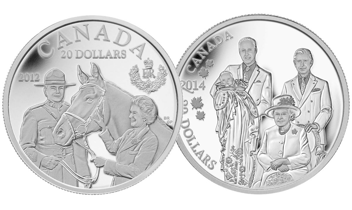 RCM Lot; includes 2012 & 2014 $20 Fine Silver Coin The Queen in Canada with the RCMP and Royal Generations. Lot of 2 coins. Comes in original packaging. Tax Exempt.