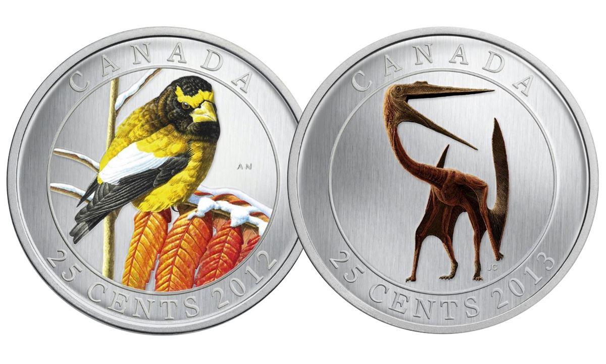 RCM Lot; includes 2012 25¢ Evening Grosbeak & 2013 Quetzalcoatlus. Lot of 2 coins both in original cases.