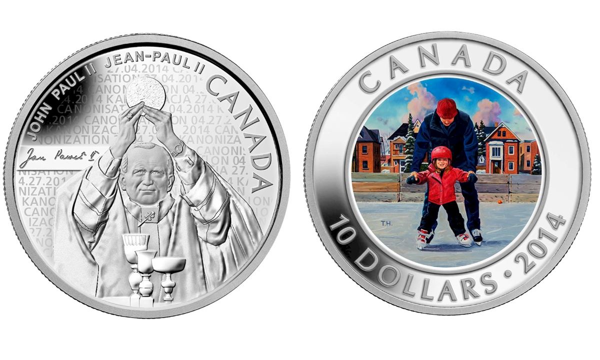 RCM Lot; includes 2014 $10 Pope John Paul and Skating in Canada. Lot of 2 coins. Comes in original packaging. Tax Exempt.