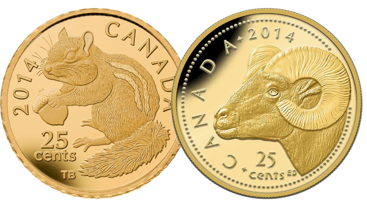 RCM Lot; includes 2014 25¢ Fine Gold Chipmunk, Rocky Mountain Bighorn Sheep. Lot of 2 coins. Comes in original packaging. Tax Exempt.