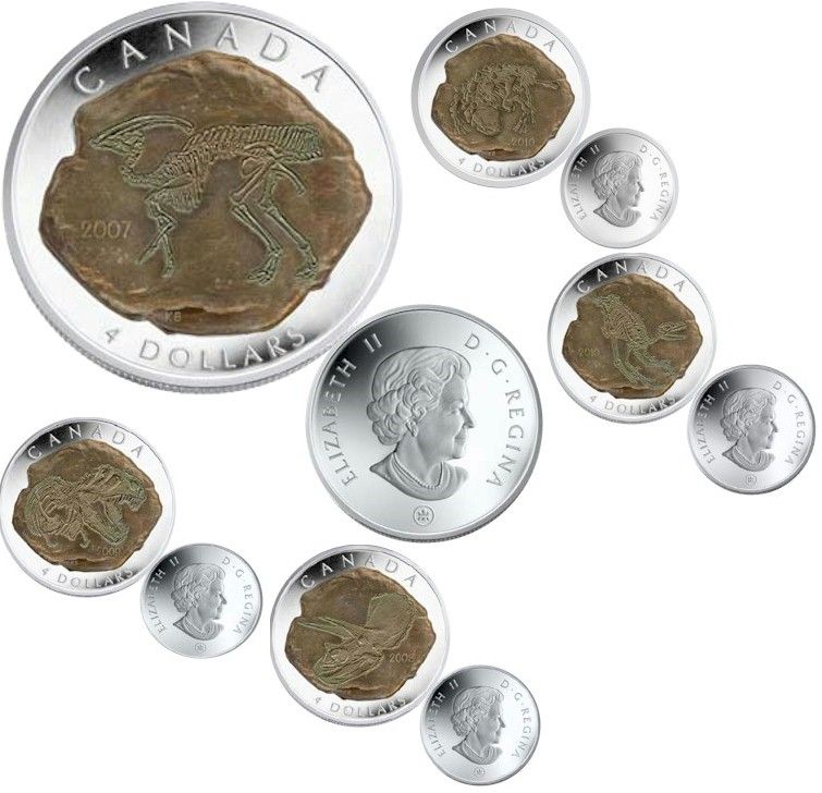 RCM Lot; includes $4 Proof 2007 Parasaurolophus, 2008 Triceratops, 2009 Tyrannosaurus Rex, 2010 Euplocephalus & Dromaeosaurus. Lot of 5 coins. Tax Exempt