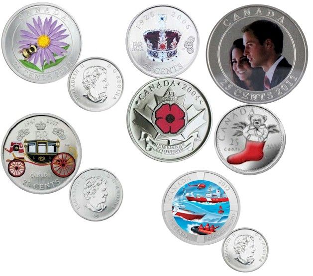 RCM Lot; includes Coloured 25¢ 2004P Santa Calus, 2005P Stocking, 2005P Poppy, 2006P Carnaval, 2006 Jewel Crown, 2007 60th Wedding Ann, 2001 Prince, 2012 Aster & 2012 Coast Guard. Lot of 9 pcs PLs & Specimens.