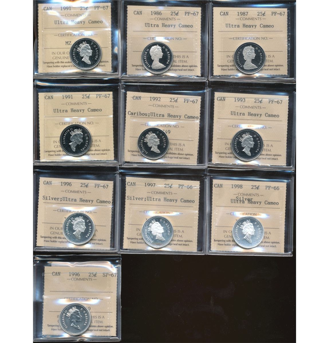 RCM Lot; includes Proof 25¢ 1986, 1987, 1991(2), 1992, 1993, 1996, 1997 & 1998 all ICCS PF66/67 along with 1996 SP67. Lot of 10 coins.
