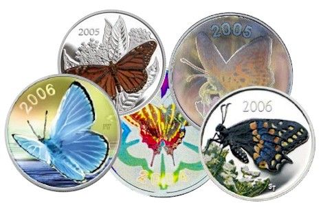 RCM Lot; includes Proof 50¢ Butterfly Series 2004 Tiger Swallowtail, 2005 Fritillary, Monarch, 2006 Short Tailed Swallowtail & Silvery Blue. Lot of 5 coins in original packaging.