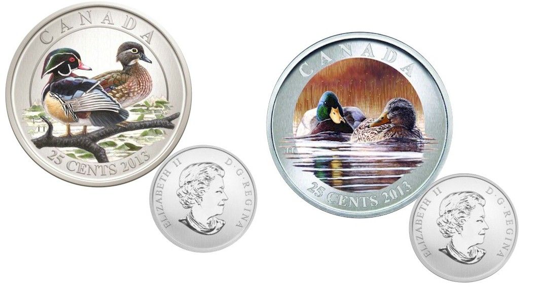 RCM Lot; includes Proof Coloured 2013 25¢ Coloured Ducks, Mallard & Wood Duck. Lot of 2 coins.