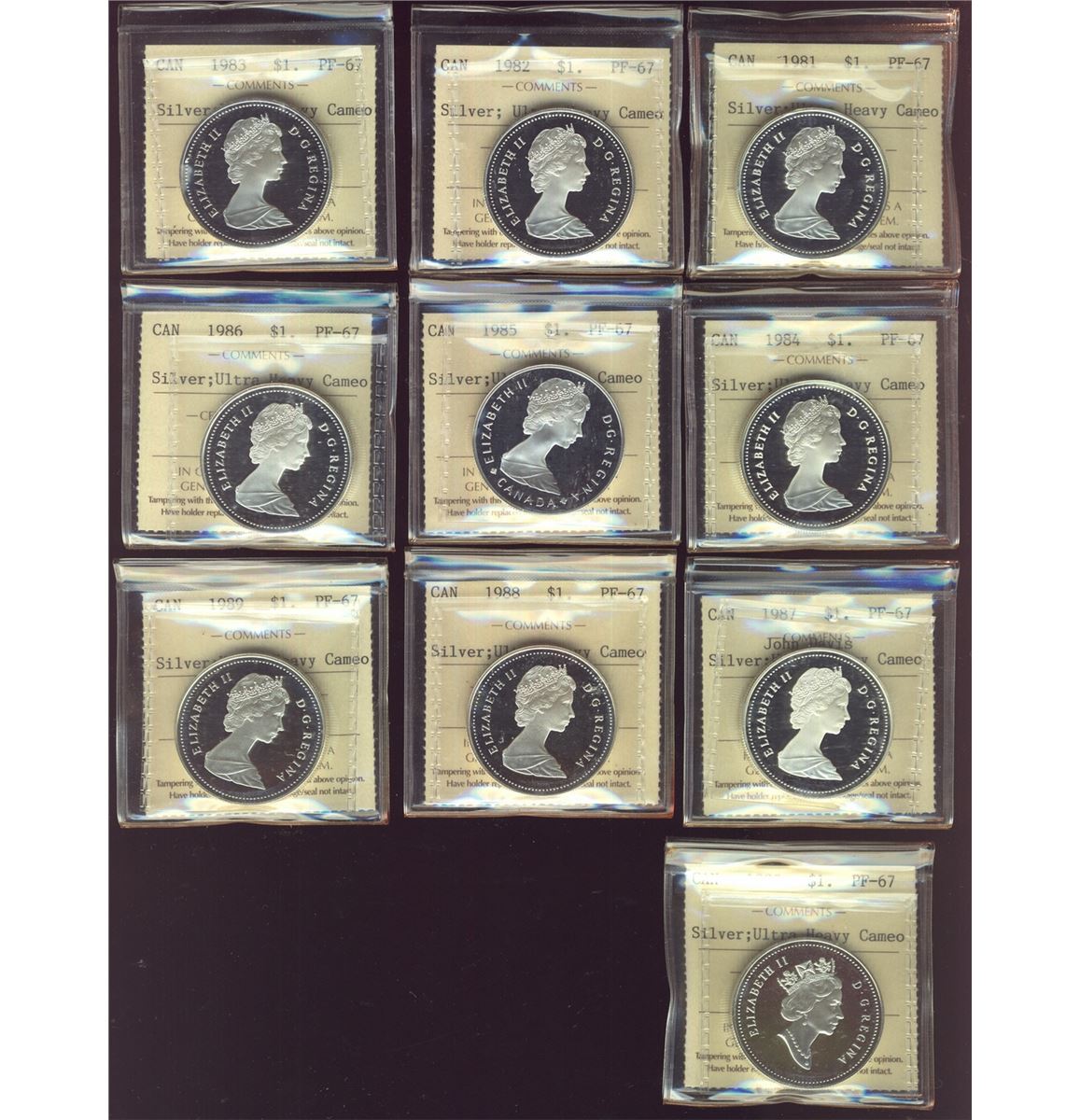 RCM Lot; includes Proof Silver Dollars series 1981 to 1990 all ICCS PR67 Ultra Heavy Cameo. Lot of 10 coins.