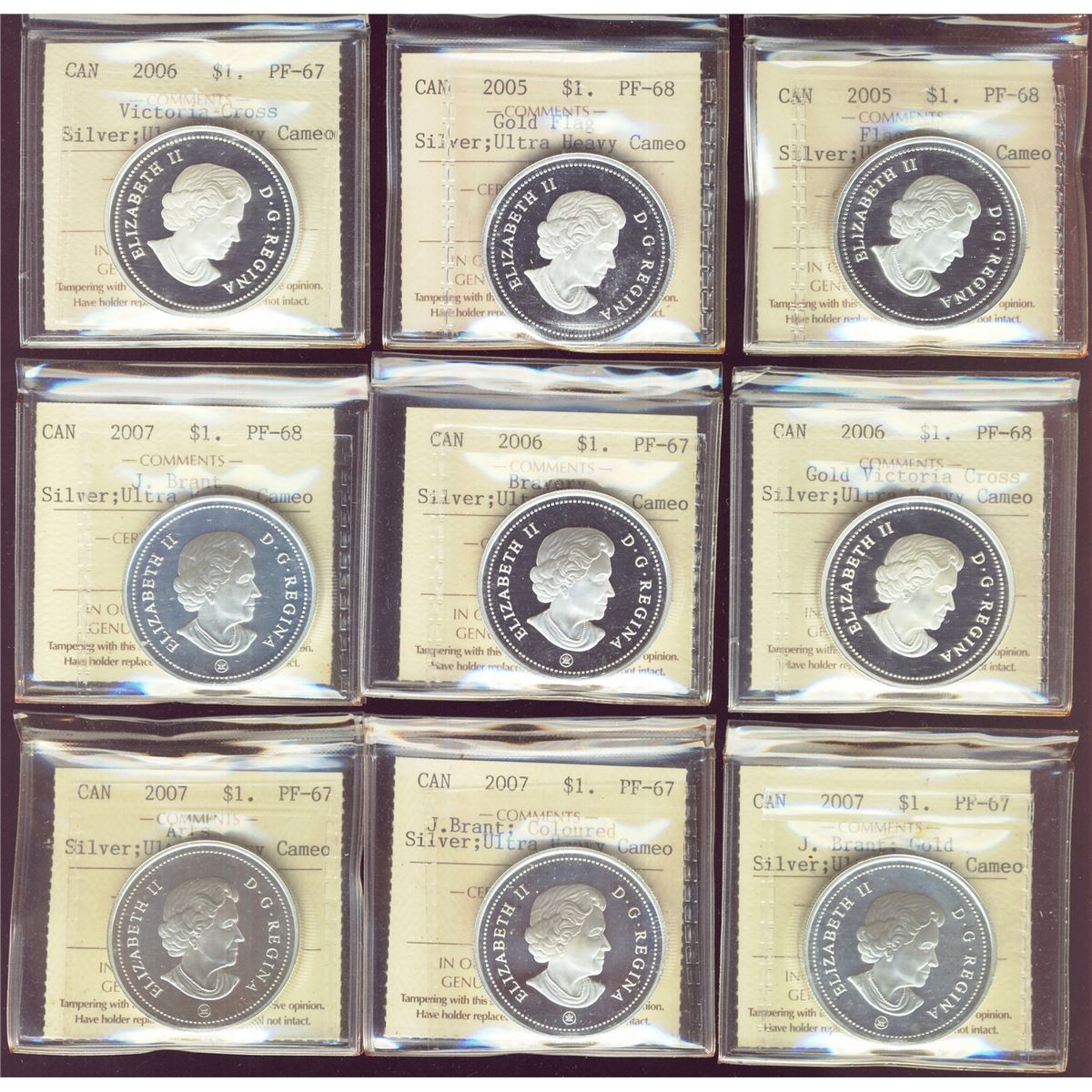 RCM Lot; includes Proof Silver Dollars series 2005 to 2007 all ICCS PR66-PR68 Ultra Heavy Cameo. Lot of 9 coins including Enameled 2007 issue