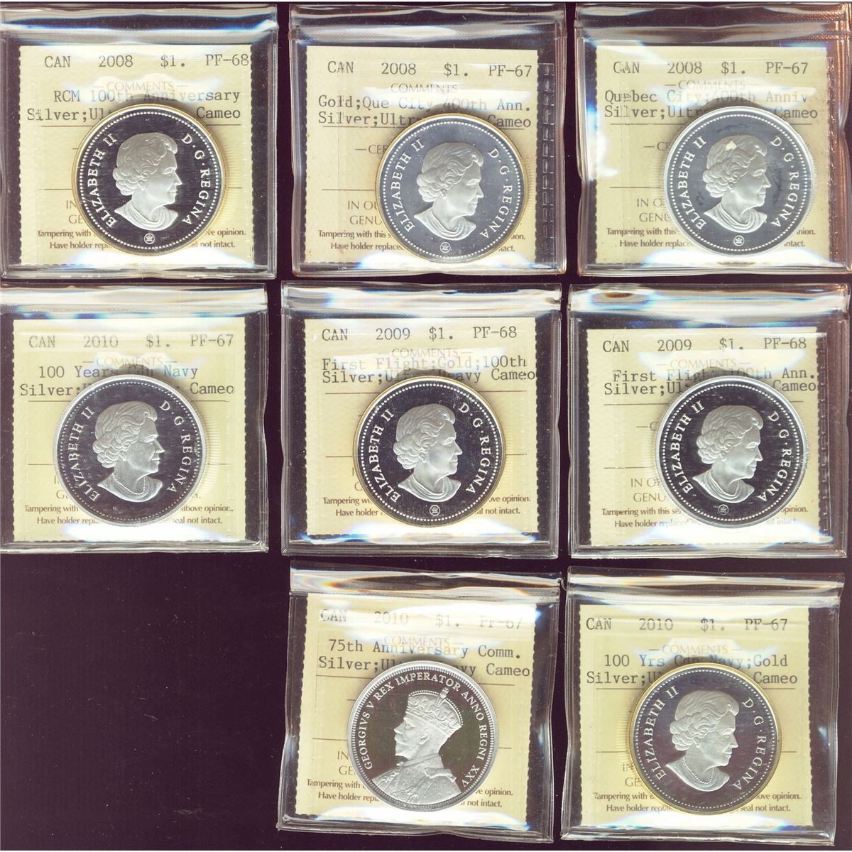 RCM Lot; includes Proof Silver Dollars series 2008 to 2010 all ICCS PR67-PR68 Ultra Heavy Cameo. Lot of 8 coins.
