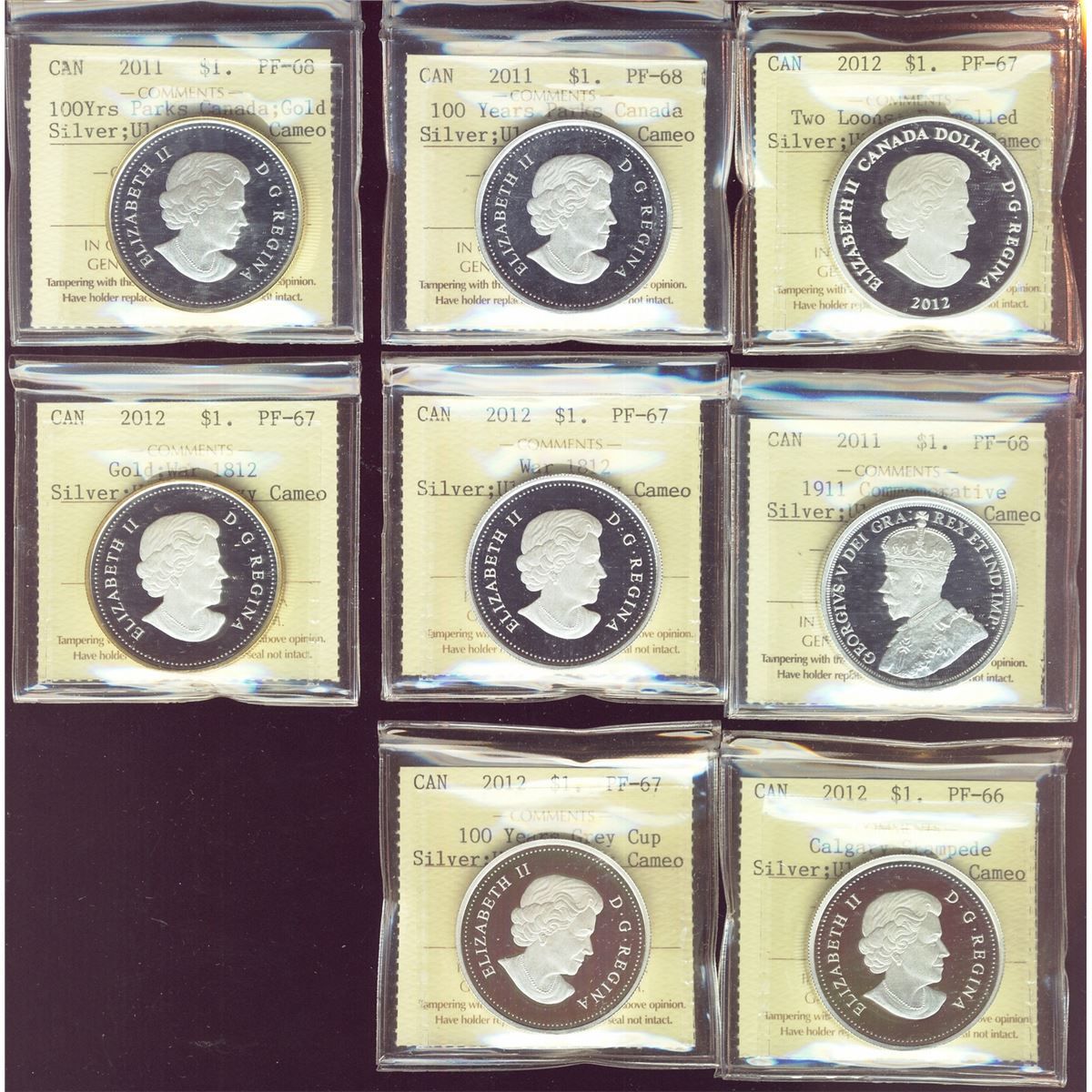 RCM Lot; includes Proof Silver Dollars series 2011 to 2012 all ICCS PR66-PR68 Ultra Heavy Cameo. Lot of 8 coins.