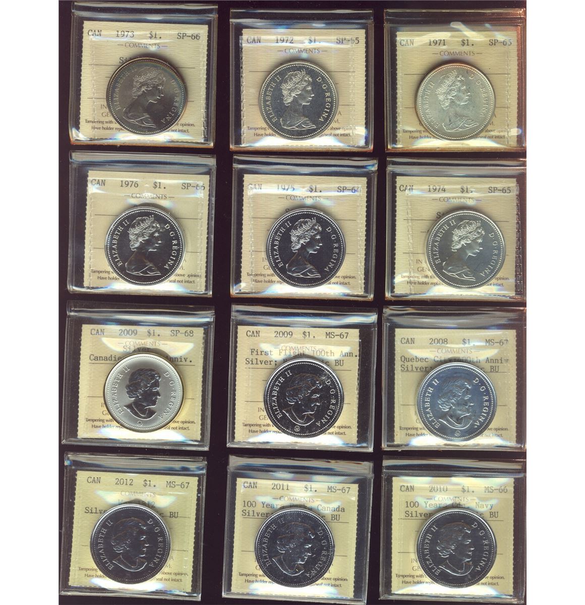 RCM Lot; includes Silver Case Dollars 1971-2012 series. Includes 45 coins including 2004 with Privy Mark, 2009 First Flight & Canadiens issues as well as 2012 25th Ann Silv Matte Dbl Loon. All coins graded ICCS SP65 to SP68 with a few MS66-67 NBU, but consists mainly of SP66 & SP67 grades.