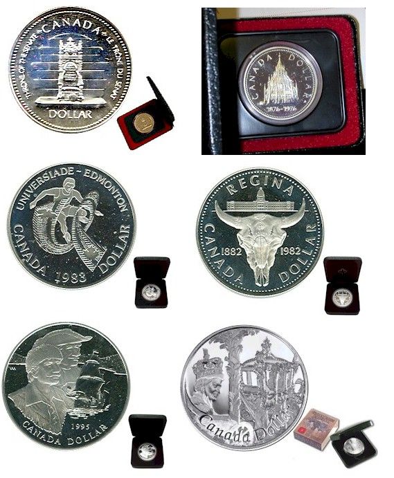 RCM Lot; includes UNC/Proof Dollars 1971, 1973, 1975, 1976, 1977(3), 1978(2), 1979, 1981(2), 1982(2), 1983(2), 1995 & 2002. Also includes BU Dollar 1993 and Nickel Case Dollar 1976. Lot of 20 pcs all in original cases.