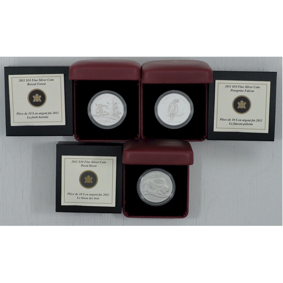 RCM Lot of 2011 International Year of Forests $10 Fine Silver coins. You will receive a 2011 $10 Fine Silver Boreal Forest, 2011 Peregrine Falcon and the 2011 Wood Bison. 3pcsEach coin comes in all the original Mint packaging. Buyers Premium will be added on all items as per our terms of sale. We accept Paypal, Credit Card, E-Transfer Payments, Cheque or Money Orders (there is an additional 3% fee for using Paypal or Credit Card). All invoices will be emailed immediately following the auction, please contact us if you would like to pay by credit card or receive a new revised lower total for mailing in payment or sending an e-transfer (3% discount). All Items Are Sold "AS IS", no returns