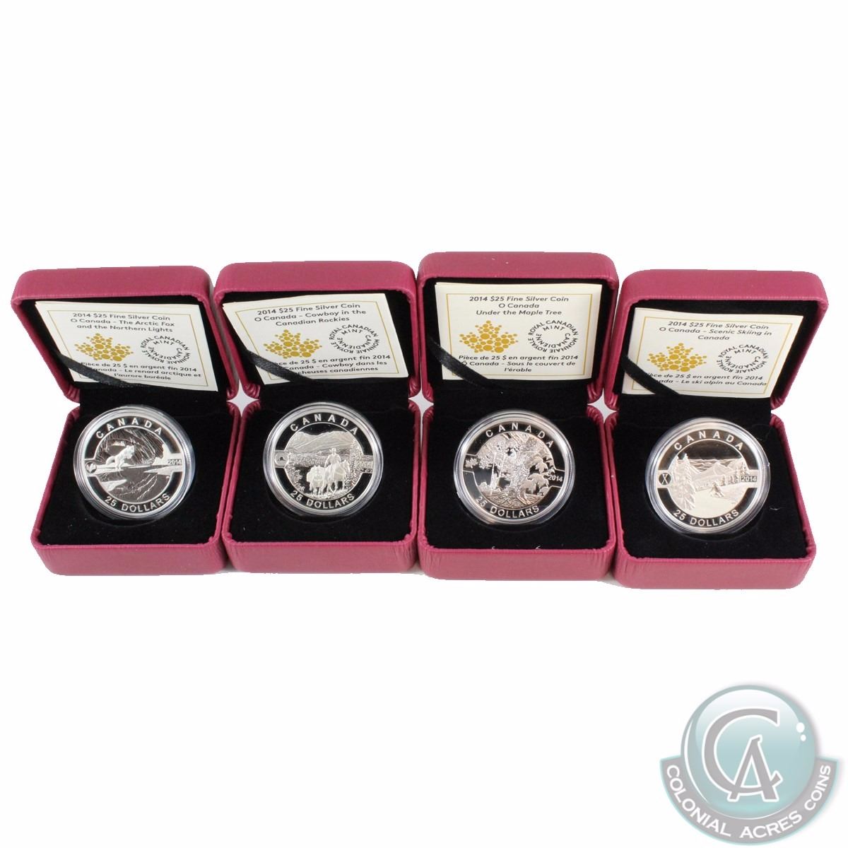 RCM Lot of 2014 $25 Fine Silver 'O' Canada Series Coins. You will receive the following $25 Fine Silver Coins with all their original Mint packaging: Under the Maple Tree (scuffed outer cardboard sleeve), Cowboy in the Canadian Rockies, Scenic Skiing in Canada and the Arctic Fox and the Northern Lights 2014 $25 Fine Silver Coins. (Tax exempt) 4pcs