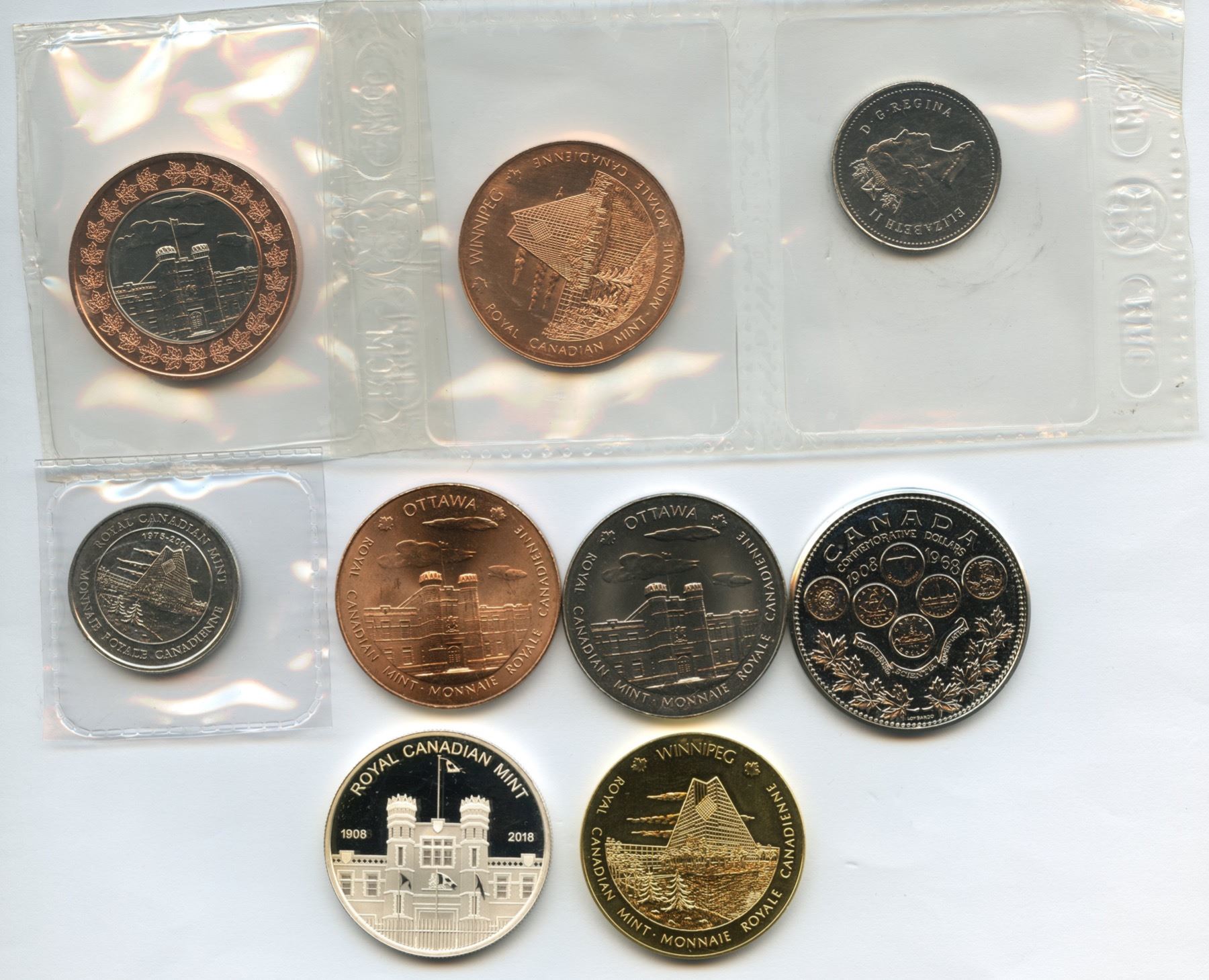 Includes: 2018 silver medallion from set; 90th Anniversary of RCM, Bi-metallic, sealed in original RCM packaging; 1998 50 cents + RCM copper medallion, sealed in original RCM packaging, hard-to-find; RCM Medallion - Winnipeg and Ottawa mints - three metals (nickel, copper, gold-plated nickel); RCM 1975-2000 medallion from 1999p test token set; 1908-1968, Honoring 60 years of numismatic excellence, commemorative dollars (Lombardo mint). 9 Pcs.