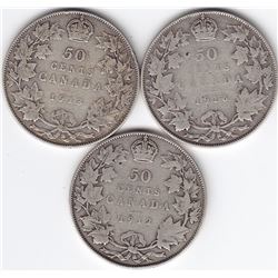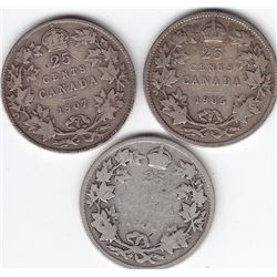 3 Canadian Edwardian Silver 25-Cent Quarter Coins - 1904 (G-6), 1905 (VG) & 1907 (VG-10)