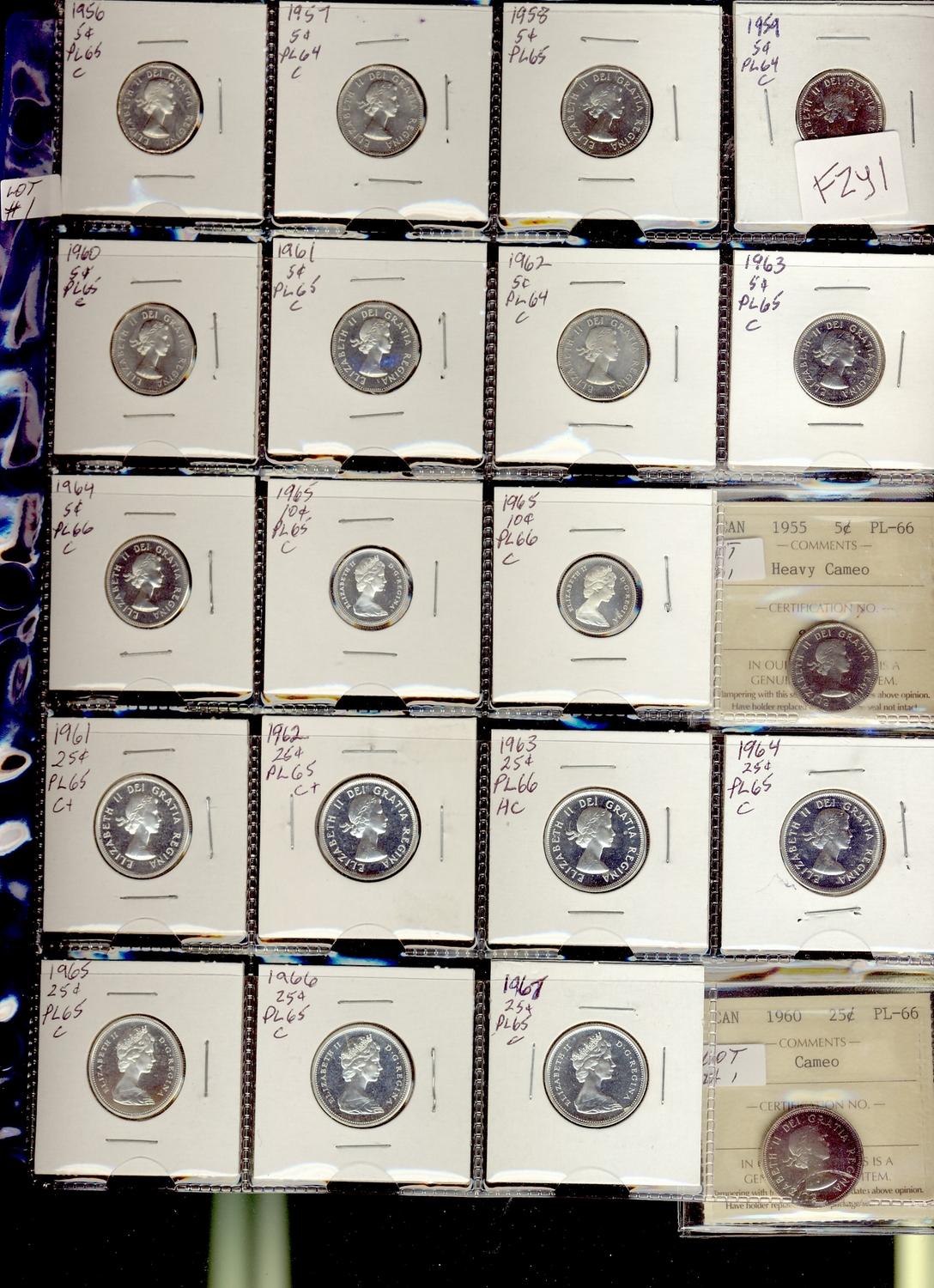 RCM Proof like single coins, Includes 5¢ 1955 to 1964, 10¢ 1965(2), 25¢ 1960 to 1967. Lot of 20 coins with 1955 5¢ ICCS PL66 HC and 1960 25¢ ICCS PL66 Cam.