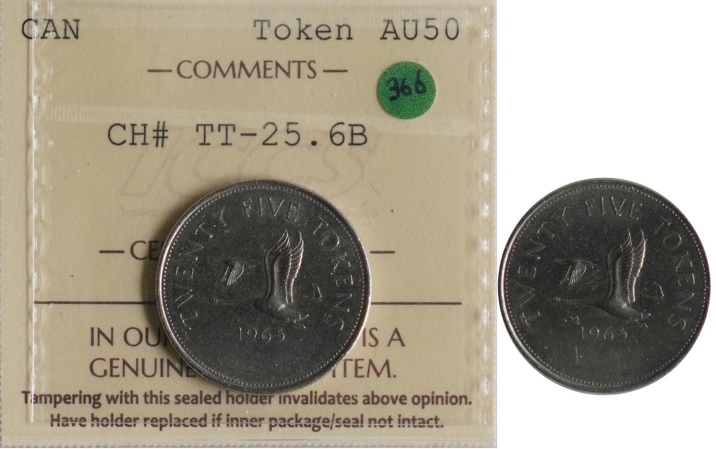 RCM Test Token;  TT-25.6B ICCS About Uncirculated-50.  1965 Round 3 Geese Nickel example.