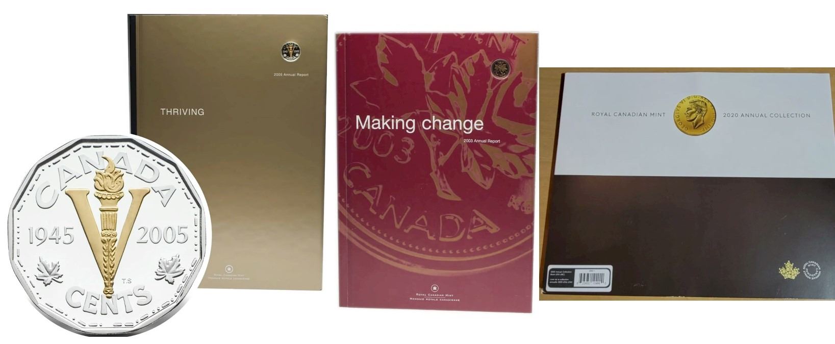 RCM lot; 2003 Royal Canadian Mint Annual Report with Gold Plated 1 cent, 2005 Royal Canadian Mint Annual Report with Gold-Plated Sterling Silver 'Victory' 5-cent, 2020 Annual Collection Book. Lot of 3 books.