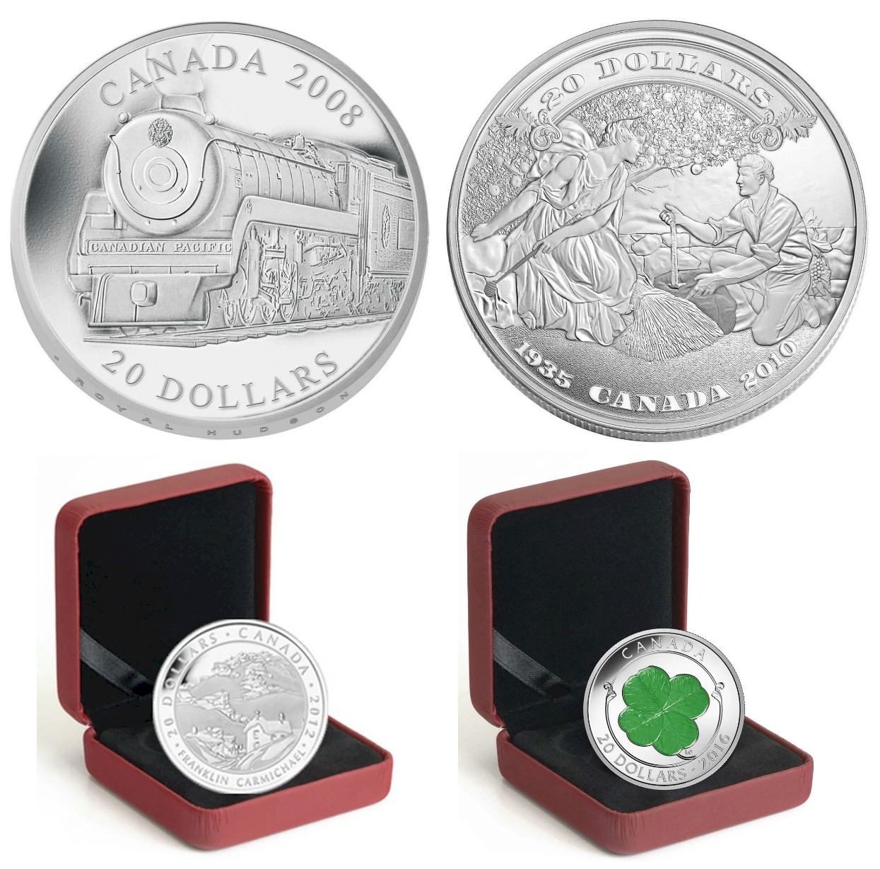 RCM lot; 2008 $20 The Royal Hudson, 2010 $20 First Bank Notes Issued By the Bank of Canada, 75th Anniversary, 2012 $20 Group of Seven: Franklin Carmichael, Houses, Cobalt, 2016 $20 Four Leaf Clover - Pure Silver Coin. Lot of 4 coins. Tax Exempt.
