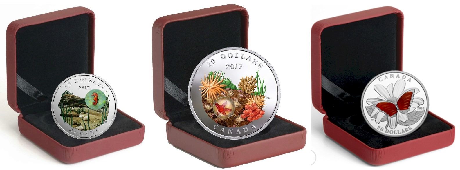 RCM lot; 2016 $20 The Colourful Wings of a Butterfly, 2017 $20 Under the Sea: Seahorse, 2017 $20 Under the Sea: Sea Star. All Pure Silver Coin. Tax Exempt.