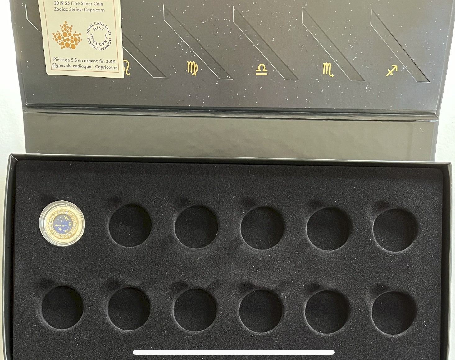 RCM lot; 2019 $5 Zodiac Series: Capricorn - Pure Silver Coin. Includes a box of Zodiac series series. Tax Exempt.