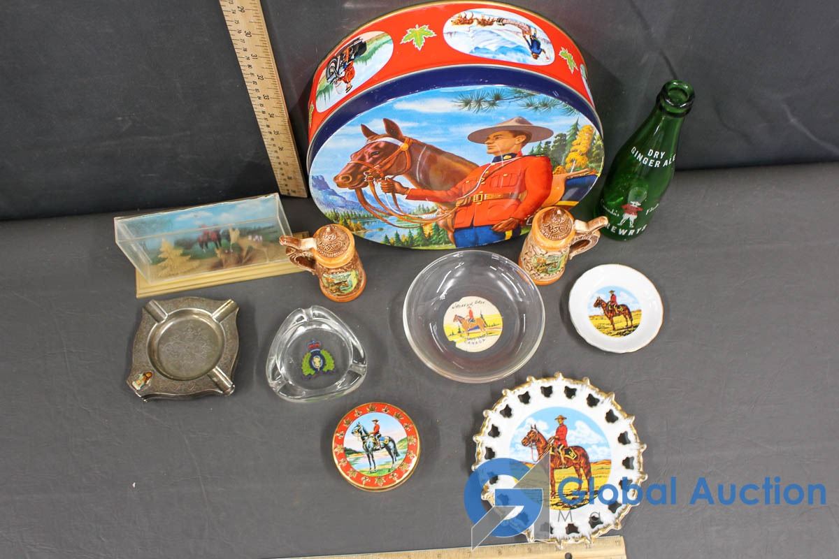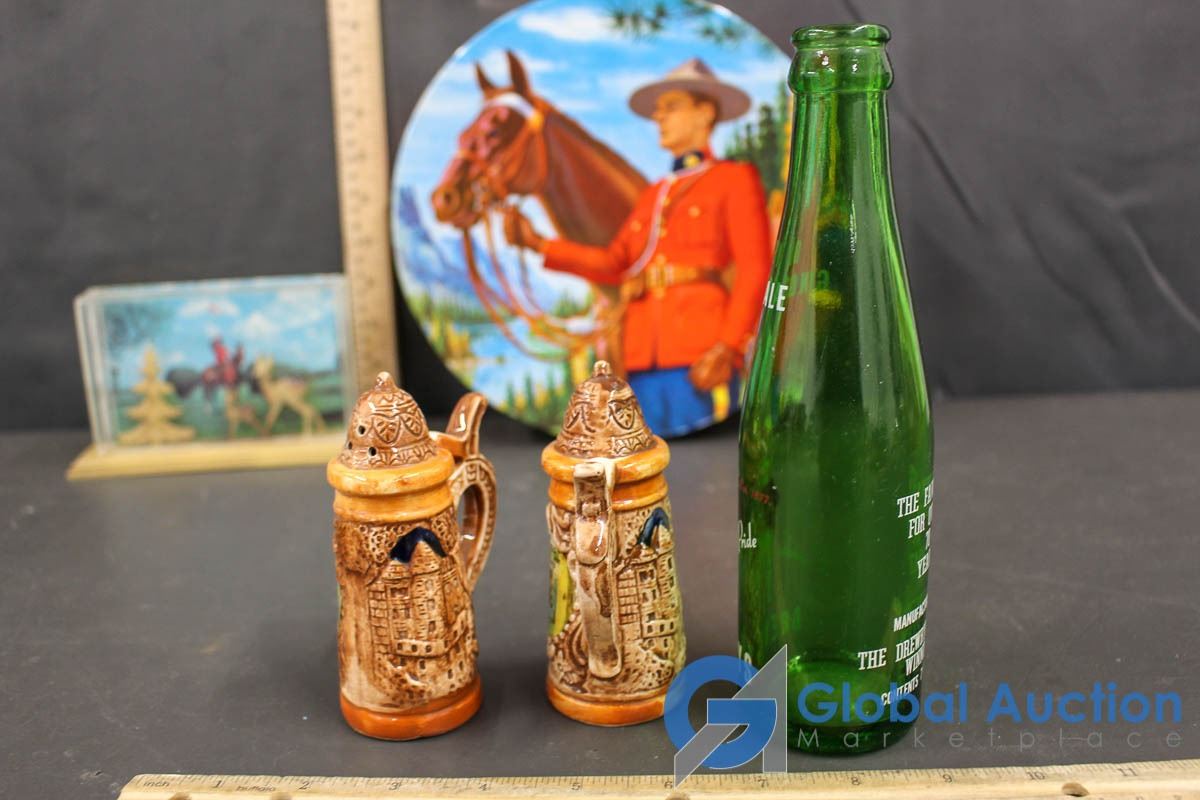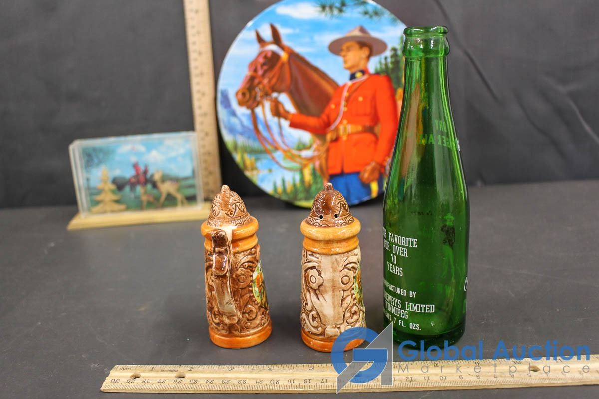 RCMP Cookie Tin, Ash Trays, Salt and Papper, Candy Tin, Canada Dry Bottle, etc.