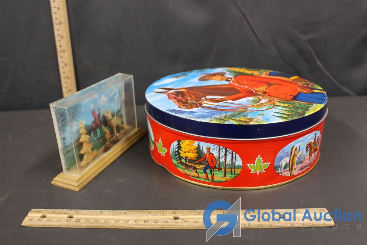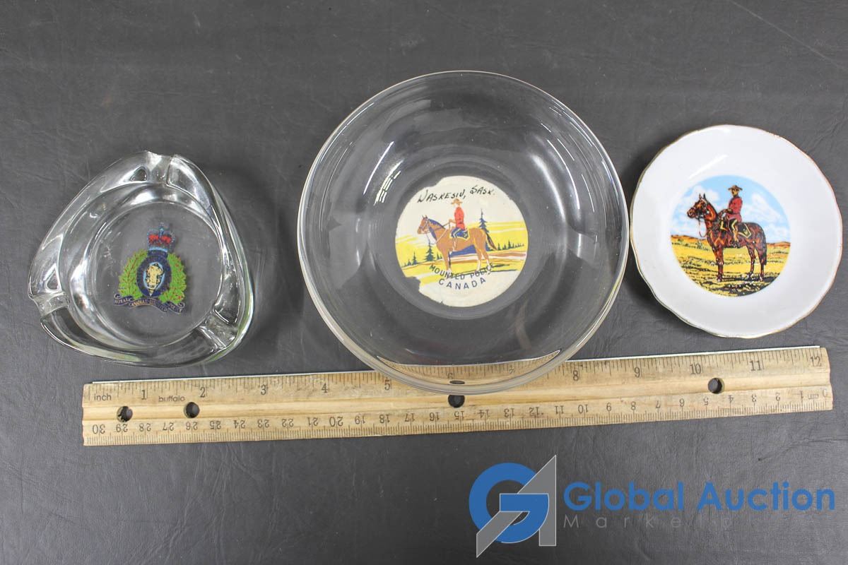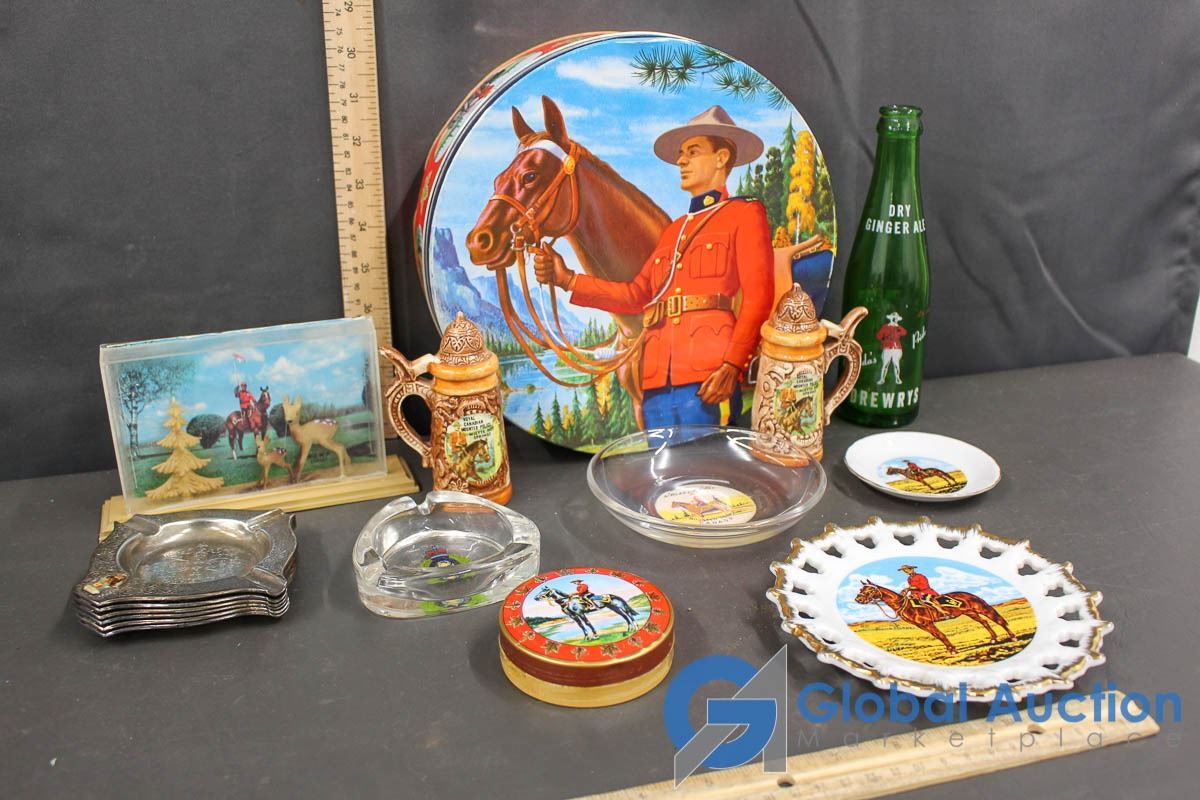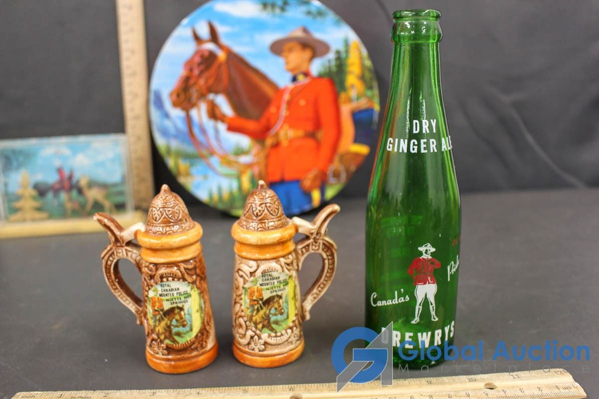 RCMP Cookie Tin, Ash Trays, Salt and Papper, Candy Tin, Canada Dry Bottle, etc.